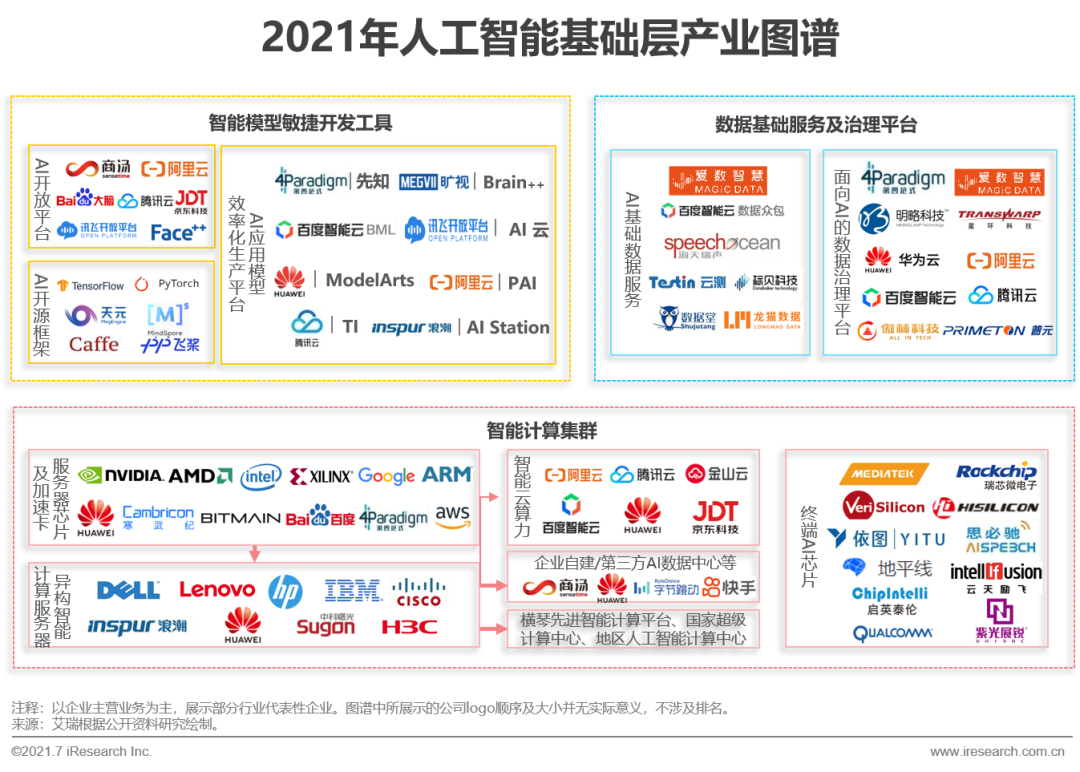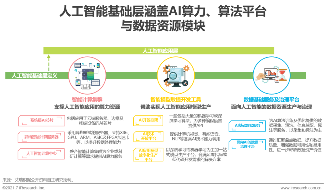 算力、算法、數(shù)據(jù)是人工智能產(chǎn)業(yè)發(fā)展的三大要素。據(jù)此,人工智能基礎(chǔ)層主要包括智能計算集群、智能模型敏捷開發(fā)工具、數(shù)據(jù)基礎(chǔ)服務(wù)與治理平臺三個模塊。智能計算集群提供支撐AI模型開發(fā)、訓(xùn)練或推理的算力資源,包括系統(tǒng)級AI芯片和異構(gòu)智能計算服務(wù)器,以及下游的人工智能計算中心等;智能模型敏捷開發(fā)工具模塊主要實現(xiàn)AI應(yīng)用模型的生產(chǎn),包括開源算法框架,提供語音、圖像等AI技術(shù)能力調(diào)用的AI開放平臺和AI應(yīng)用模型效率化生產(chǎn)平臺;數(shù)據(jù)基礎(chǔ)服務(wù)與治理平臺模塊則實現(xiàn)AI應(yīng)用所需的數(shù)據(jù)資源生產(chǎn)與治理,提供AI基礎(chǔ)數(shù)據(jù)服務(wù)及面向AI的數(shù)據(jù)治理平臺。AI基礎(chǔ)層企業(yè)通過提供AI算力、開發(fā)工具或數(shù)據(jù)資源助力人工智能應(yīng)用在各行業(yè)領(lǐng)域、各應(yīng)用場景落地,支撐人工智能產(chǎn)業(yè)健康穩(wěn)定發(fā)展。