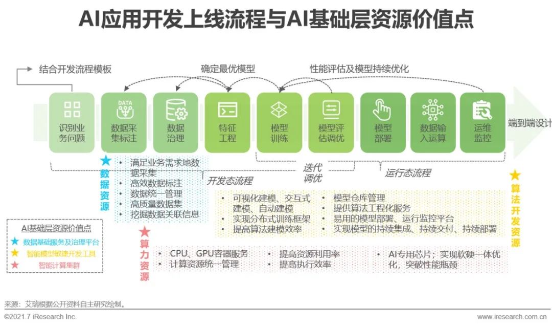 開發(fā)一項人工智能模型并上線應(yīng)用大致需經(jīng)歷從業(yè)務(wù)理解、數(shù)據(jù)采標(biāo)及處理、模型訓(xùn)練與測試到運維監(jiān)控等一系列流程。過程中需要大量的AI算力、高質(zhì)量數(shù)據(jù)源、AI應(yīng)用算法研發(fā)及AI技術(shù)人員的支持,但大部分中小企業(yè)用戶并不具備在“算力、數(shù)據(jù)、算法”三維度從0到1部署的能力,而財力雄厚的大型企業(yè)亦需高性價比的AI開發(fā)部署方案。依靠AI基礎(chǔ)層資源,需求企業(yè)可降低資源浪費情況、規(guī)避試錯成本、提高部署應(yīng)用速度。作為支撐AI模型開發(fā)及落地的必要資源,AI基礎(chǔ)層可在多環(huán)節(jié)提效AI技術(shù)價值的釋放;其工具屬性也標(biāo)志著AI產(chǎn)業(yè)社會化分工的出現(xiàn),AI產(chǎn)業(yè)正逐步進(jìn)入低技術(shù)門檻、低部署成本、各產(chǎn)業(yè)深度參與雙向共建的效率化生產(chǎn)階段。