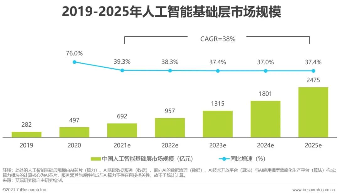 AI企業(yè)突破業(yè)務(wù)增長瓶頸的需求是人工智能基礎(chǔ)層發(fā)展的驅(qū)動力之一。當(dāng)前人工智能核心產(chǎn)業(yè)規(guī)模保持線性增長態(tài)勢,且增速趨于平穩(wěn)與常態(tài)化。為尋求產(chǎn)值增長突破點,AI企業(yè)發(fā)力探索開拓市場的有效手段。依托人工智能基礎(chǔ)層資源建設(shè),AI企業(yè)可有效應(yīng)對下游客戶的長尾應(yīng)用需求,再將高頻應(yīng)用轉(zhuǎn)化為新主營業(yè)務(wù)。此外“新基建”、半導(dǎo)體自主可控等相關(guān)政策扶持、傳統(tǒng)行業(yè)智能化轉(zhuǎn)型等因素也都在助推人工智能基礎(chǔ)層資源的發(fā)展。據(jù)艾瑞測算,2021-2025年,人工智能基礎(chǔ)層市場規(guī)模CAGR為38%,整體產(chǎn)業(yè)規(guī)模發(fā)展速度較快、空間較為廣闊,總體呈現(xiàn)持續(xù)增長的走勢。2020年,中國人工智能基礎(chǔ)層市場規(guī)模為497億元,為人工智能產(chǎn)業(yè)總規(guī)模的33%,市場規(guī)模相較去年同比增長76%,AI應(yīng)用模型效率化生產(chǎn)平臺創(chuàng)收增長、AI芯片市場規(guī)模隨著云端訓(xùn)練需求出現(xiàn)較高增長等是同比增速的主要拉動力;2021-2024年同比增速趨于平緩下降,市場開始恢復(fù)穩(wěn)步增長態(tài)勢。到2025年,中國人工智能基礎(chǔ)層市場規(guī)模將達(dá)到2475億元,云端推理與端側(cè)推理芯片市場持續(xù)走高使得人工智能基礎(chǔ)層整體市場同比增速稍有抬升。