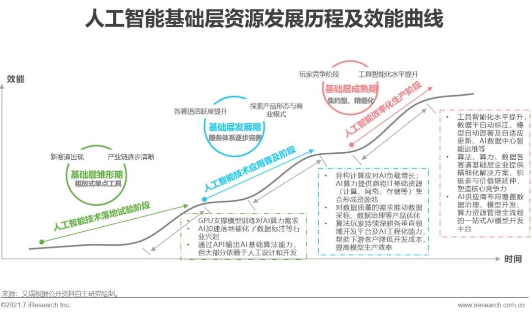 智能化轉(zhuǎn)型趨勢下,企業(yè)部署AI項目的需求正經(jīng)歷著變化,對數(shù)據(jù)質(zhì)量、模型生產(chǎn)周期、模型自學(xué)習(xí)水平、模型可解釋性、云邊端多樣部署方式、人力成本及資金投入、投資回報率等的要求都逐步走高。在上述需求特點及自動機器學(xué)習(xí)、AI芯片硬件架構(gòu)等技術(shù)發(fā)展的共同推動下,AI基礎(chǔ)層資源的整體效能水平也在不斷進(jìn)化,以有效降低需求企業(yè)的AI開發(fā)成本。大致涵蓋相互交融的三個階段:雛形期,算法/算力/數(shù)據(jù)各模塊多為粗放式的單點工具,新興產(chǎn)品及賽道逐步出現(xiàn);快速發(fā)展期,各賽道活躍度顯著提升,參與者積極探索產(chǎn)品形態(tài)與商業(yè)模式,基礎(chǔ)層服務(wù)體系逐步完善、資源價值凸顯;最后則向成熟階段過渡,各賽道內(nèi)企業(yè)競爭加劇,逐步跑出頭部企業(yè)。同時各賽道間企業(yè)生態(tài)合作增多,一站式工具平臺出現(xiàn)。