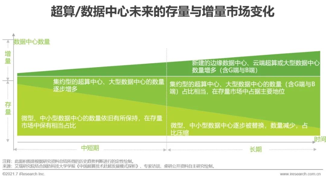 從市場變化趨勢來看:1)存量市場:日漸增加的AI計算負(fù)載需要處理力更強、能耗承受度更大的數(shù)據(jù)中心,同時,一系列有關(guān)控制數(shù)據(jù)中心PUE值的節(jié)能審查規(guī)定相繼出臺,一味盲目擴(kuò)建、新建數(shù)據(jù)中心已難合時宜,促進(jìn)老舊數(shù)據(jù)中心綠色化改造的減量替代方案因此誕生。微型、中小型數(shù)據(jù)中心會逐漸被改造為集約型的大型數(shù)據(jù)中心,符合節(jié)能減排相關(guān)標(biāo)準(zhǔn)、機柜數(shù)量與異構(gòu)組合增多的集約型超算/數(shù)據(jù)中心將在存量市場中占據(jù)主流。2)增量市場:考慮到邊緣計算可分擔(dān)AI計算任務(wù)、兼具低延時優(yōu)勢,管理邊緣計算中心則需要布局相應(yīng)的大型云端數(shù)據(jù)中心,故增量市場會被異構(gòu)的邊緣計算數(shù)據(jù)中心與云端超算或大型數(shù)據(jù)中心擴(kuò)充。