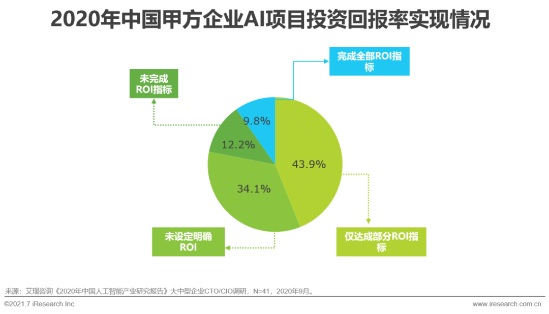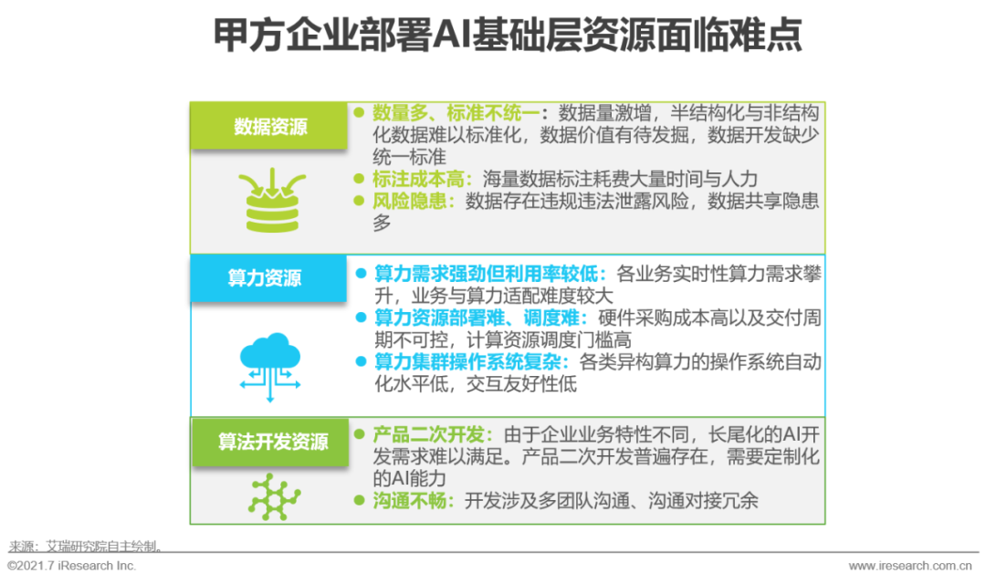 根據(jù)艾瑞2020年執(zhí)行的CTO調(diào)研,2019年超過51%的樣本企業(yè)AI相關(guān)研發(fā)費用占總研發(fā)費用比重在10%以上,2020年65.9%的企業(yè)AI研發(fā)占比達(dá)到10%以上。一方面是甲方企業(yè)不斷增長的對智能化轉(zhuǎn)型的強勁需求,一方面則是在AI應(yīng)用開發(fā)與部署過程中企業(yè)普遍面臨的數(shù)據(jù)質(zhì)量(49%)、技術(shù)人才(51%)等基礎(chǔ)資源配置難點。且目前只有少數(shù)企業(yè)可以完成AI項目實施前設(shè)定的全部投資回報率(ROI)標(biāo)準(zhǔn),因此甲方企業(yè)在投資AI項目時相對審慎。AI基礎(chǔ)層資源則可有效緩解甲方利用AI技術(shù)重塑自身業(yè)務(wù)時的投資矛盾,提升模型生產(chǎn)效率,降低部署成本:數(shù)據(jù)資源集群具備數(shù)據(jù)采標(biāo)與數(shù)據(jù)治理能力,且一站式的數(shù)據(jù)平臺可對實時數(shù)據(jù)進(jìn)行統(tǒng)一管理,提高數(shù)據(jù)利用率;高效的AI算力集群與調(diào)度系統(tǒng)可滿足模型訓(xùn)練與推理需求,降低總擁有成本(TCO,TotalCost of Ownership);基于算法開發(fā)平臺演化出的語音識別、計算機視覺、機器學(xué)習(xí)等專業(yè)的AI模型生產(chǎn)平臺,可提供高效、一站式的AI模型生產(chǎn)服務(wù)。